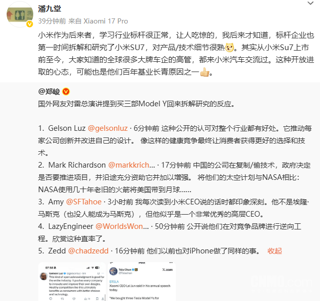 同时睿新策略,潘九堂还分享了国外网友对雷军演讲中提及买三辆特斯拉Model Y回来拆解研究一事的反应。其中,一位网友认为,这种公开的认可对整个行业都有好处,它能够促使每家企业积极创新并改进自身设计。这种健康的竞争环境,最终将使消费者获得更优质的选择和更先进的技术。另一位网友则对雷军印象深刻,他表示每次读到小米CEO雷军说的话时都印象深刻,并称赞雷军是一位非常出色的高层CEO。还有网友表示,小米公开承认对竞争品牌进行逆向工程,这种直率的态度令人欣赏。