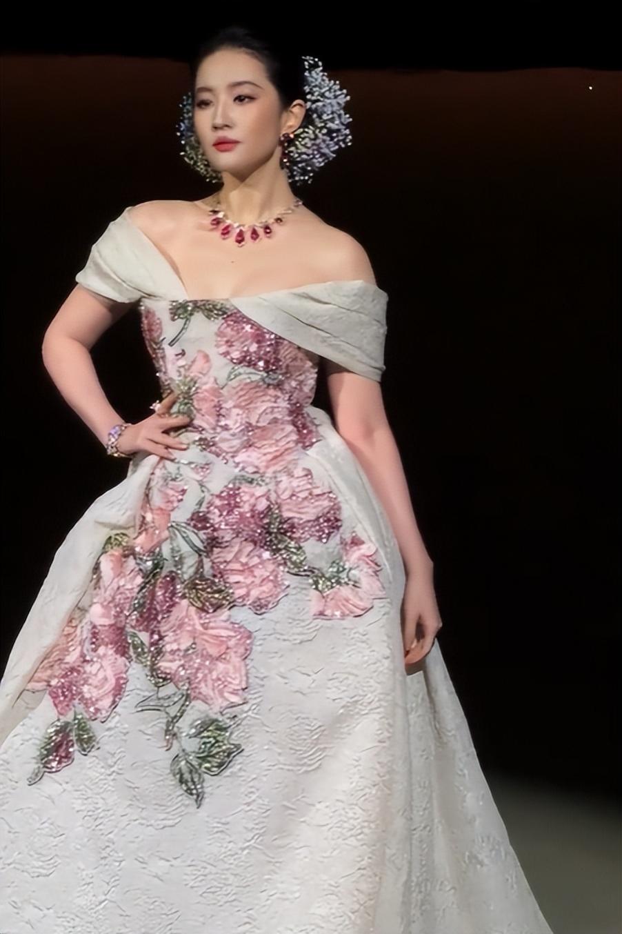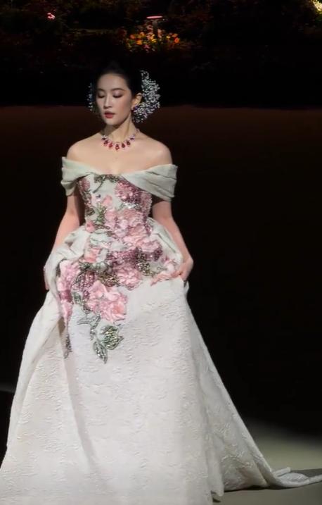 这次她选择了一套非常重工的刺绣花朵高定礼服,搭配上红宝石系列珠宝,更显得华丽无比。
