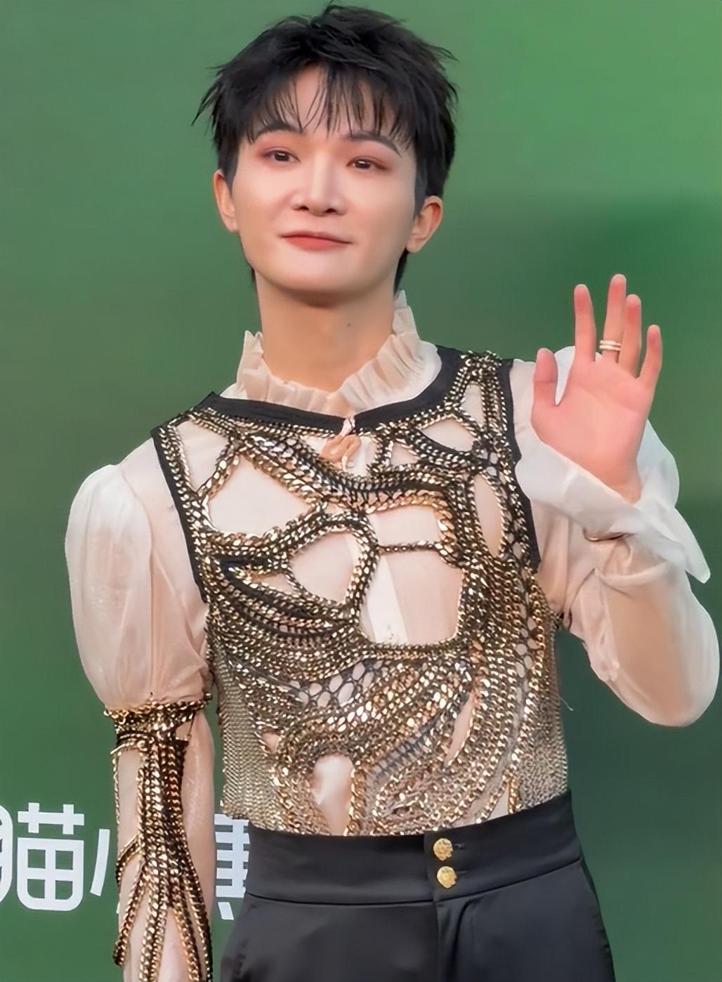 比如周深的大浓妆,就像是要去演戏似的,薄衬衫外搭金属链条马甲这样朋克感十足的穿搭,也并不适合他的长相。